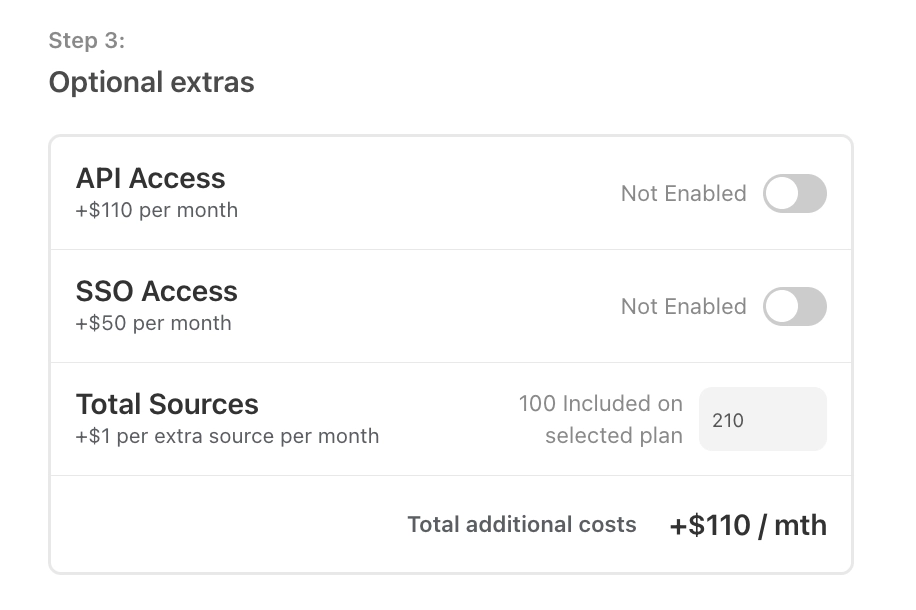 You can purchase additional sources on the Large and Premium plans for US$1/source/month. Premium and Large plan customers who pay by wire transfer should reach out to support for assistance with purchasing additional sources.