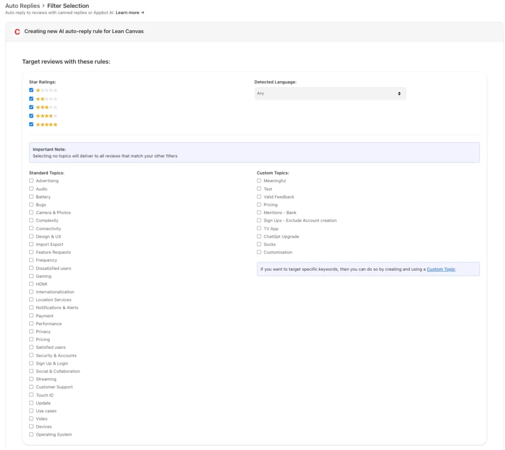 Absolutely. Appbot’s smart filters let you refine which reviews are included in your automation rules by star rating, topic, language, or app store.